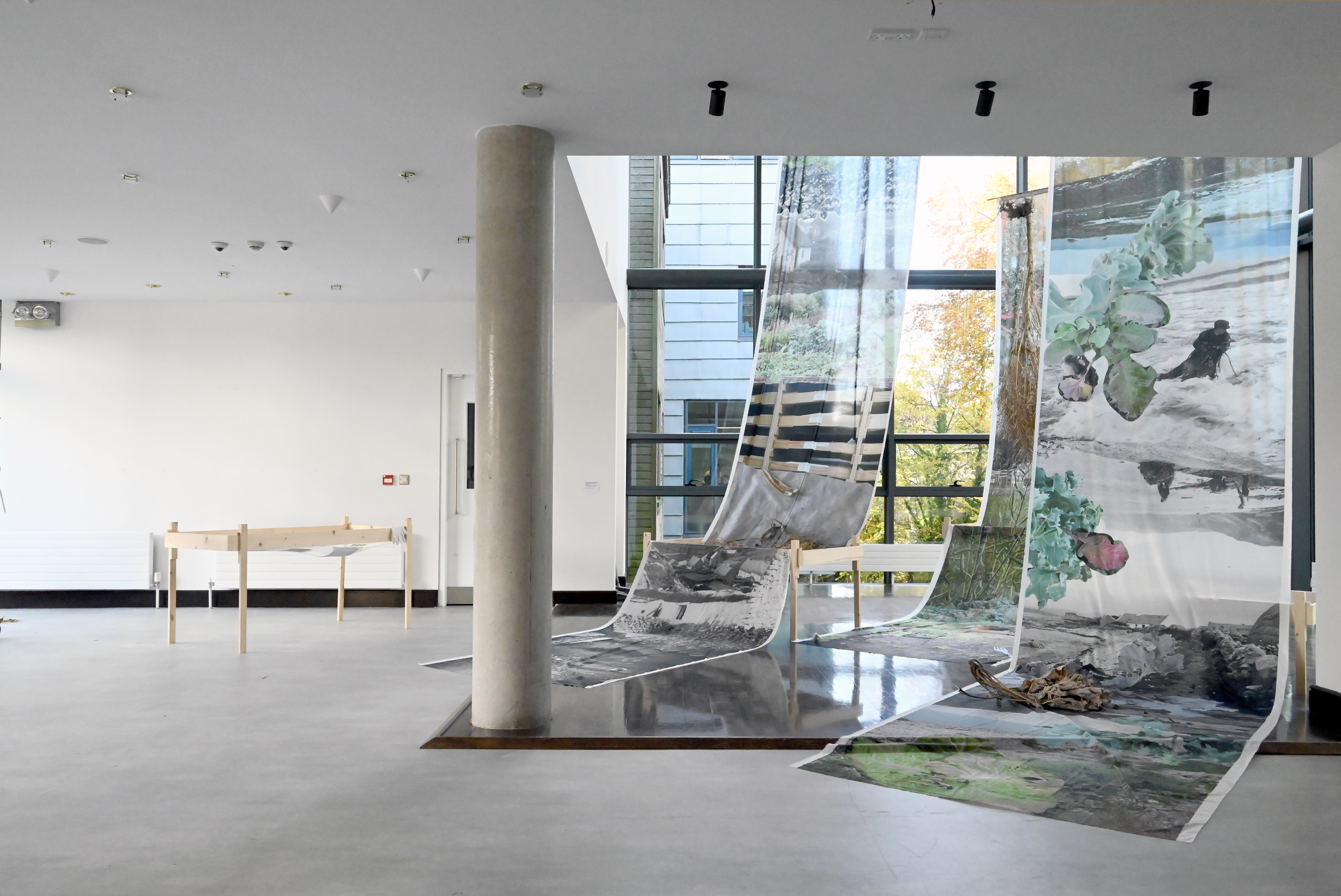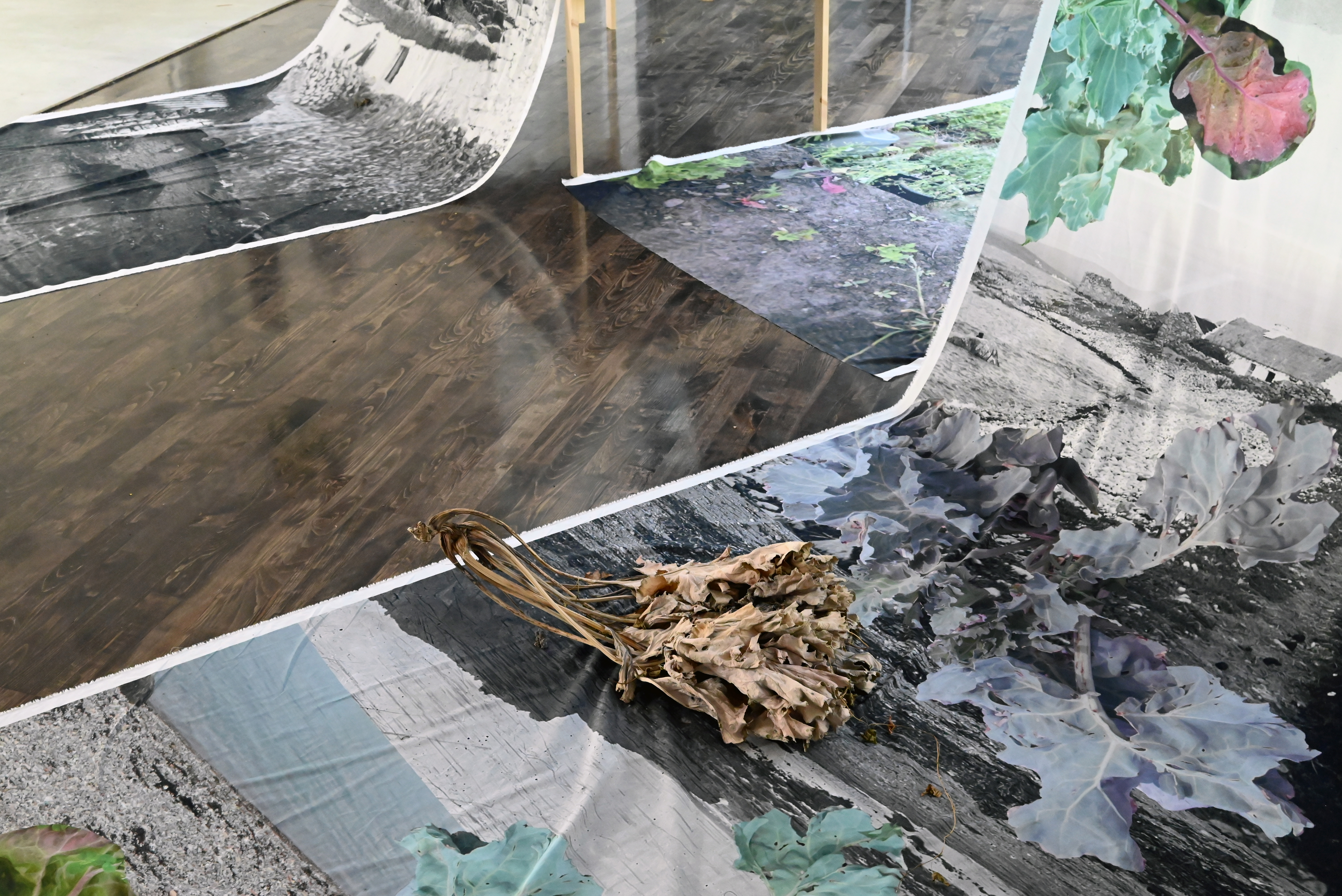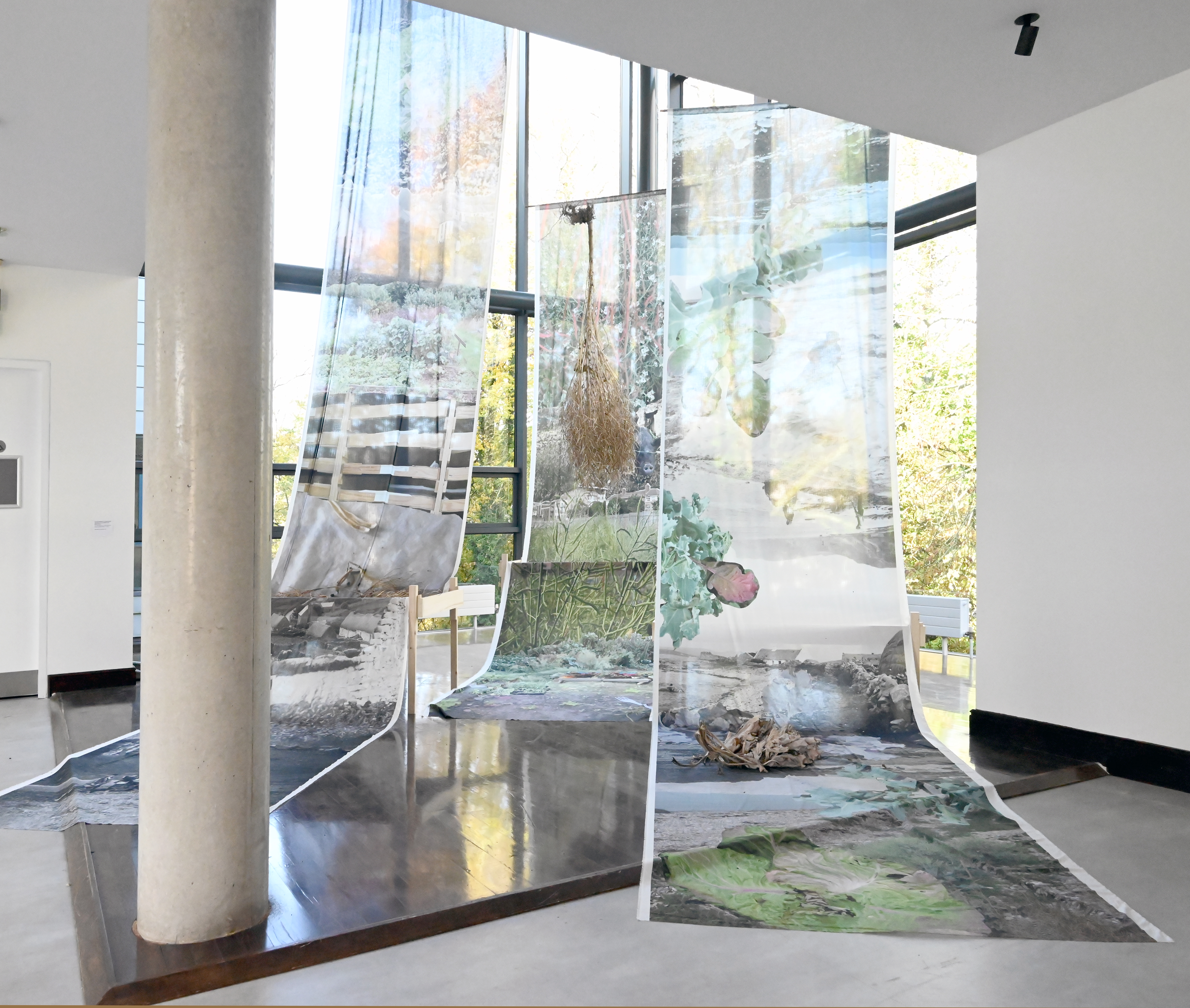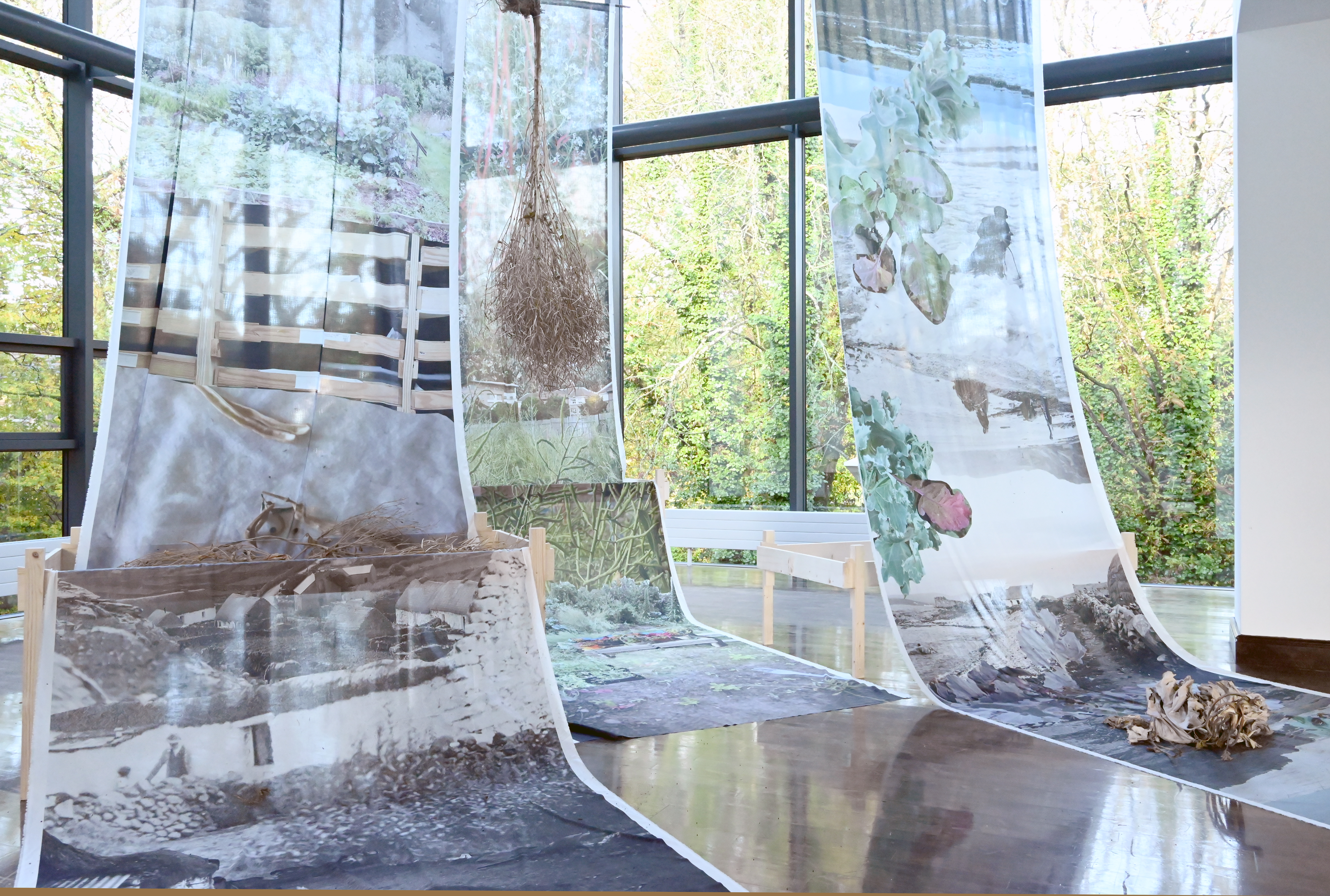 The elements in this installation refer to the practice of seed saving such as large cloths onto which the seeds can drop, strainers, fragments of photographic and other documentary material, dried pods of flowers, as well as the colour spectre of kales.
